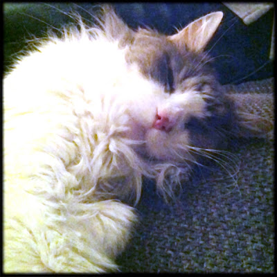 Generally, he seems content -- he purrs, he makes biscuits, and he head butts us. He still loves to have his cheeks brushed and he really enjoyed those weird treats. He hangs out with us on the couch and in bed. But... he's losing weight. And he meows all night. And today, he barely ate.